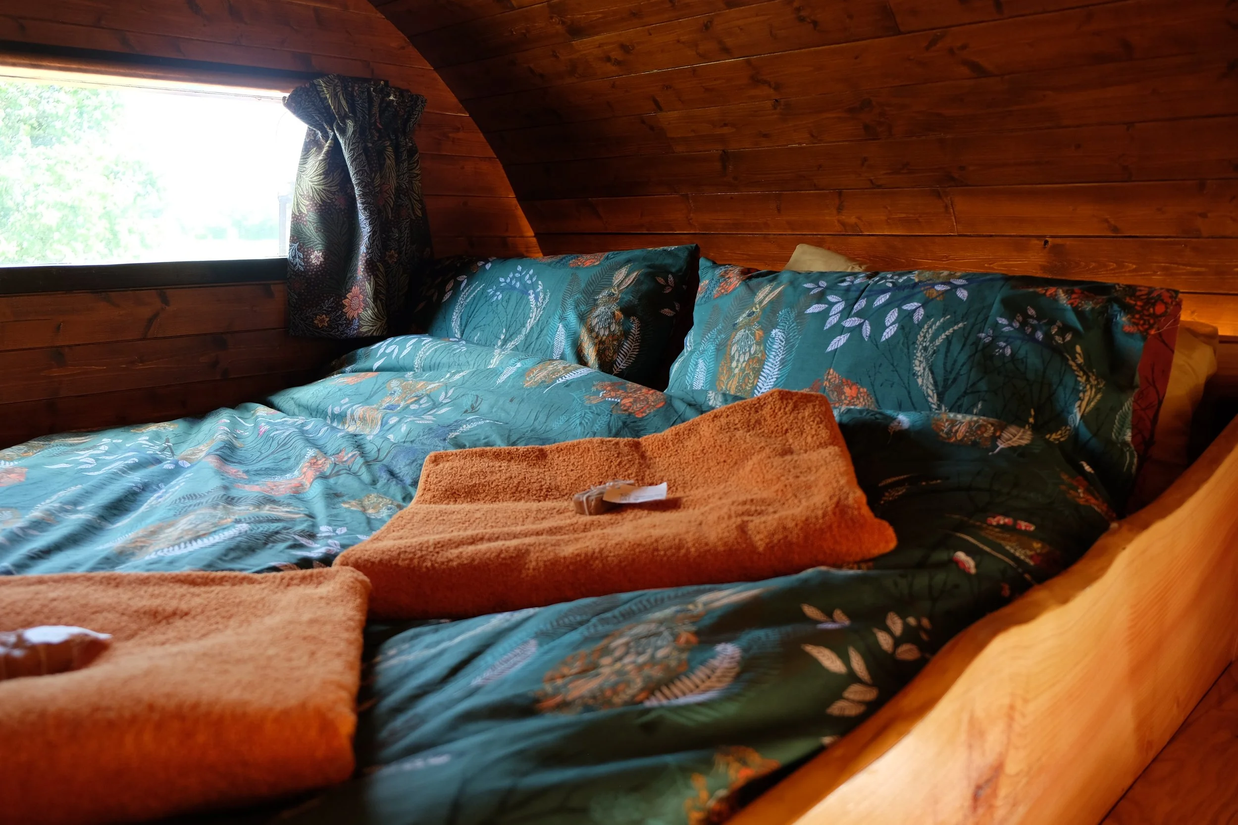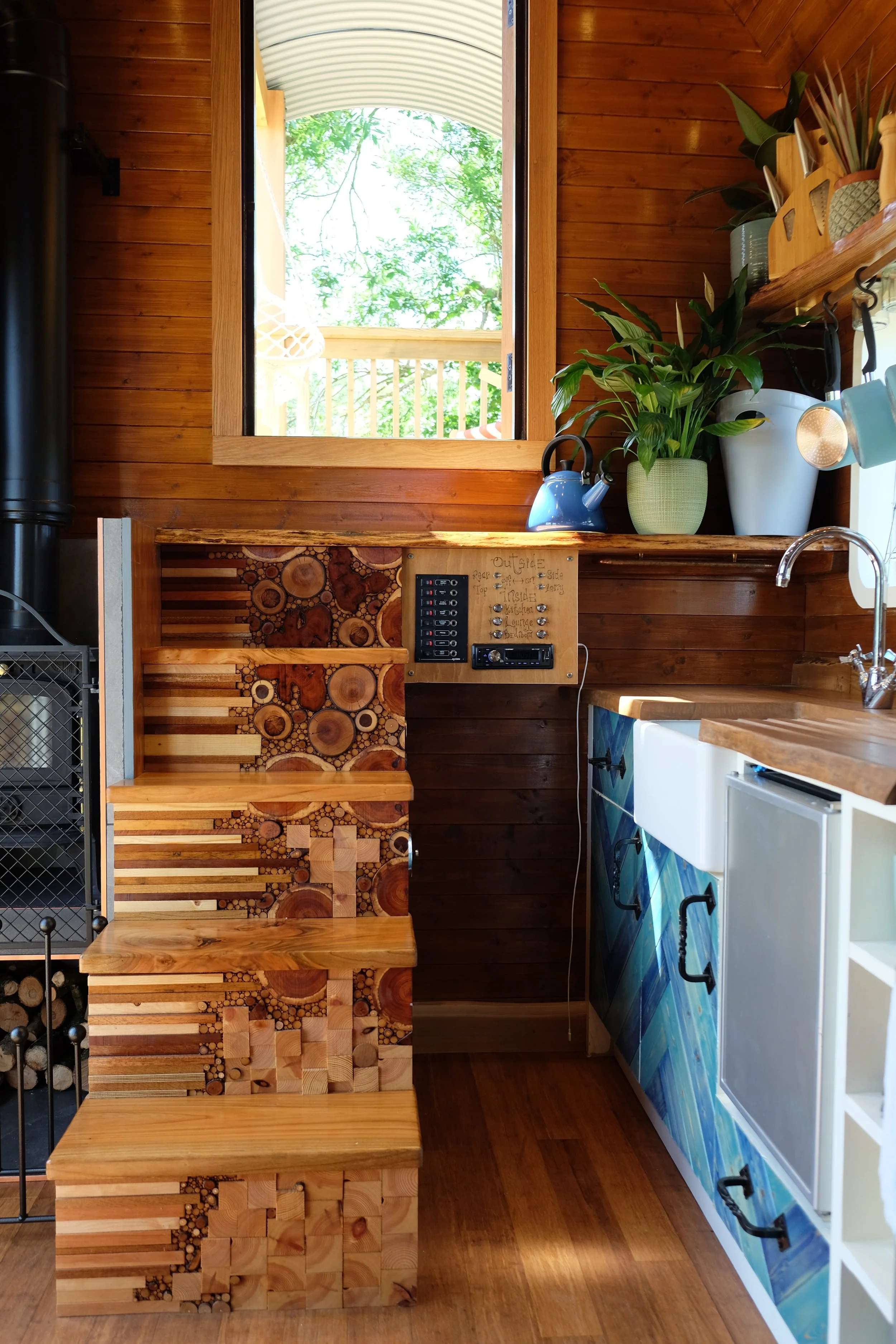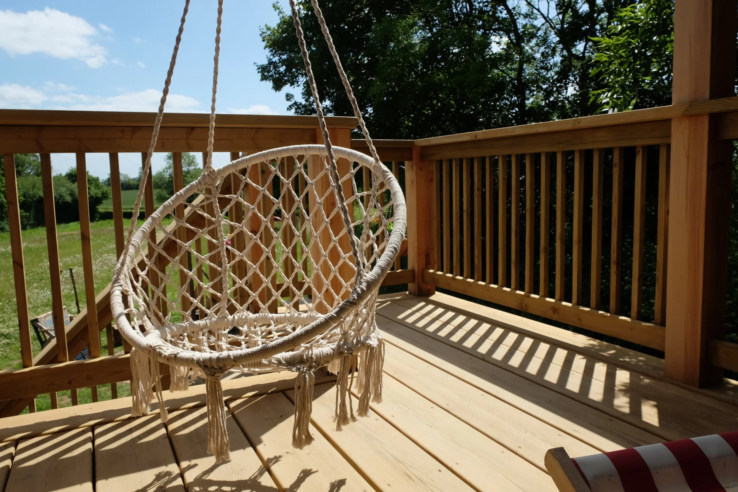 As the nights draw in and the weather turns cooler the wood burner adds instant comfort to the living space. Whilst the weather might keep you from sitting around the firepit it won’t keep you indoors. Our top deck is also covered from the weathers worst elements via a pig arc shelter roof. To keep yourself dry you can also access this top deck from the internal steps and through the hobbit door.