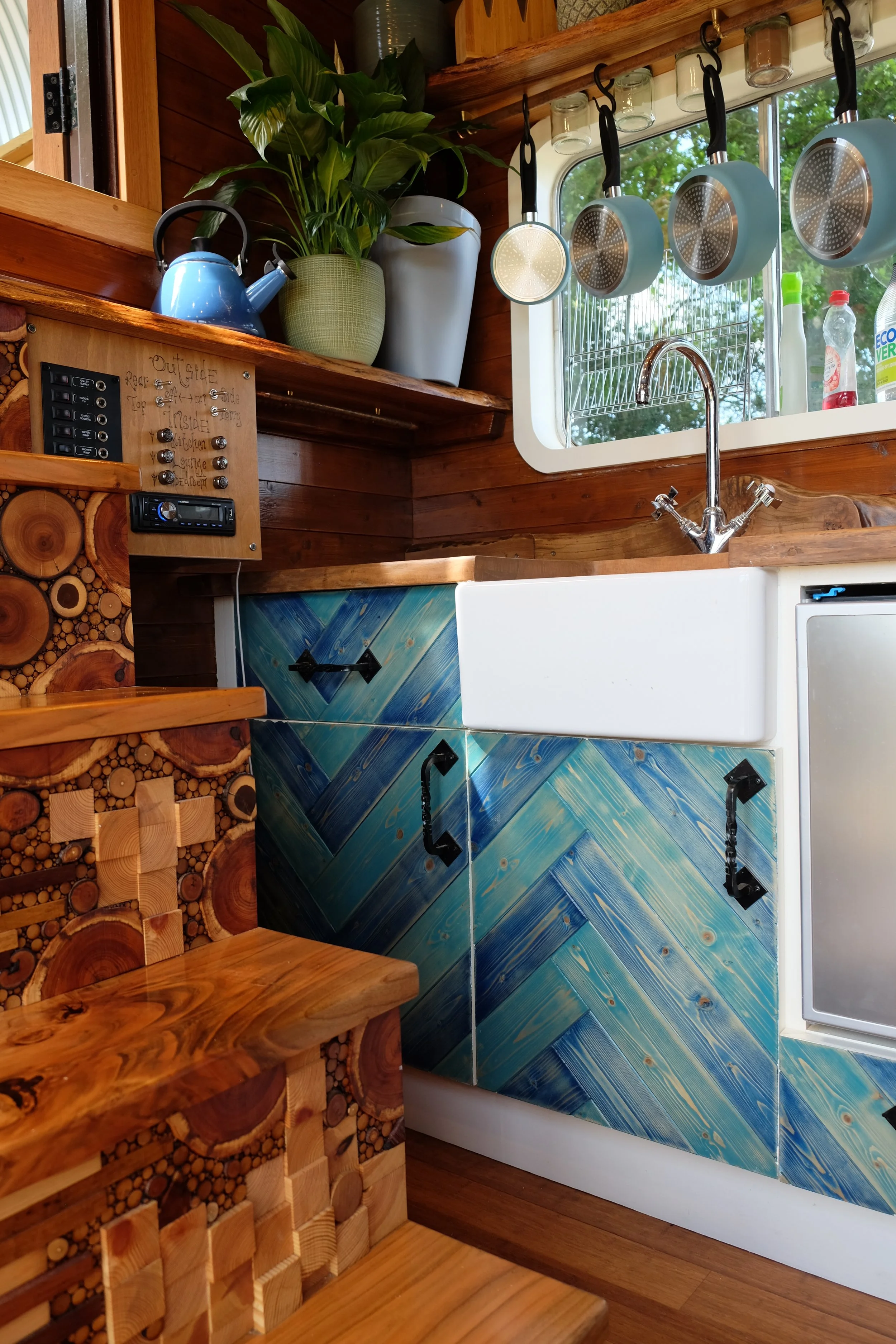 The inside space whilst off-grid, offers many home comforts that you might not expect. A large Belfast sink, housed in locally sourced milled and worked wood, provides warm suds for washing up. Whilst in the kitchen the fridge / freezer and four hob grill / oven makes for a well-stocked space for cooking. The inside dining option, provided by another hand crafted and worked yew slabt. Set to the rear of the lorry is a large sofa bed providing a comfortable and sociable space.